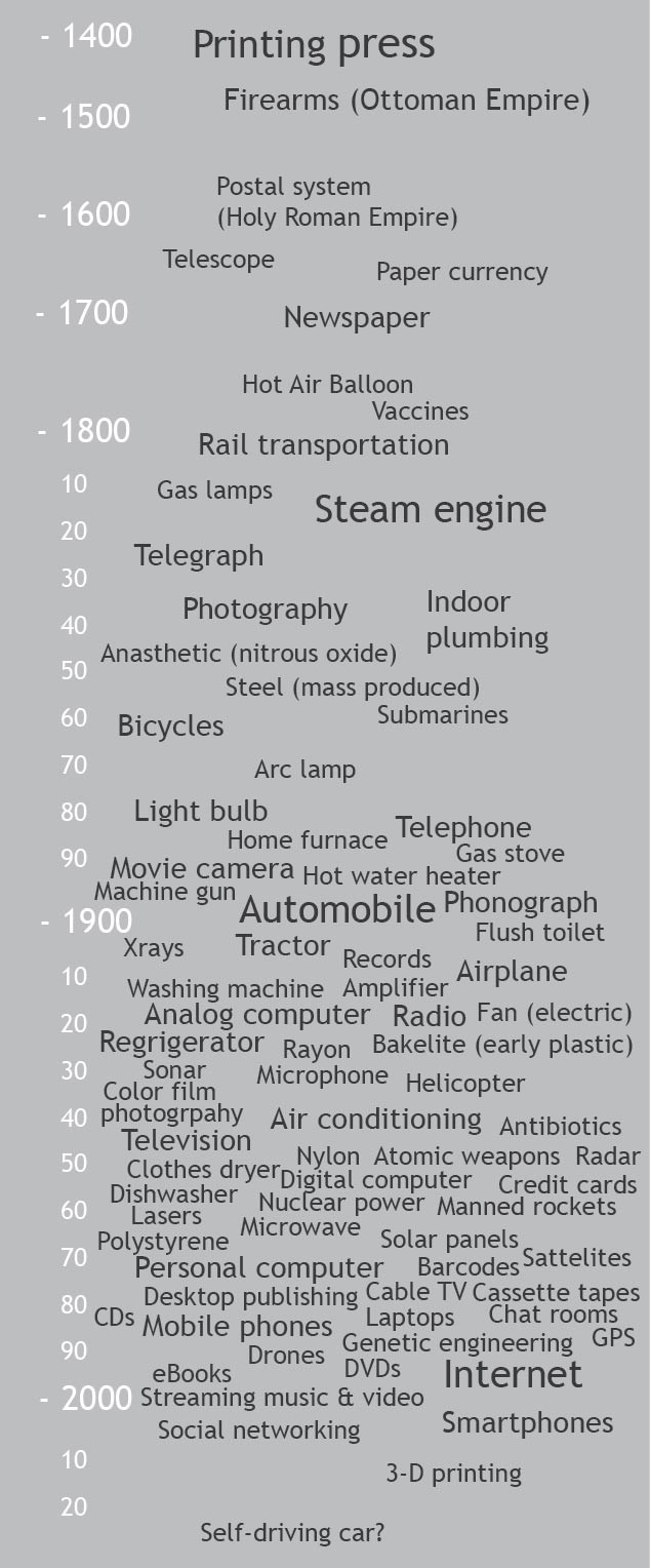 Reading Sinclair Lewis’ Main Street recently (see “A Stroll Down Main Street”) I was struck by the frentic pace of progress a century ago. Electricity, automobiles, airplanes, light bulbs, movie cameras, refrigerators, radio—these were all new technology around the year 1917. Most of us look upon our own era as one of rapidly accelerating progress, with a dynamic lifestyle that is precariously subject to change. But a glance at the chart on the right shows us to be more or less gliding in the smooth lagoon of the early 21st century. Granted, the Internet was a major breakthrough on the same level as the printing press and the steam engine that ushered in the Industrial Revolution. But the Internet is now over twenty years old, smart phones only slightly younger, and even the birth of social media is already a decade in the past. Up-and-coming technologies like nanorobotics and self-driving vehicles have not yet begun to impact our lives in a significant way. And where are the flying cars? Dammit, we were promised flying cars!